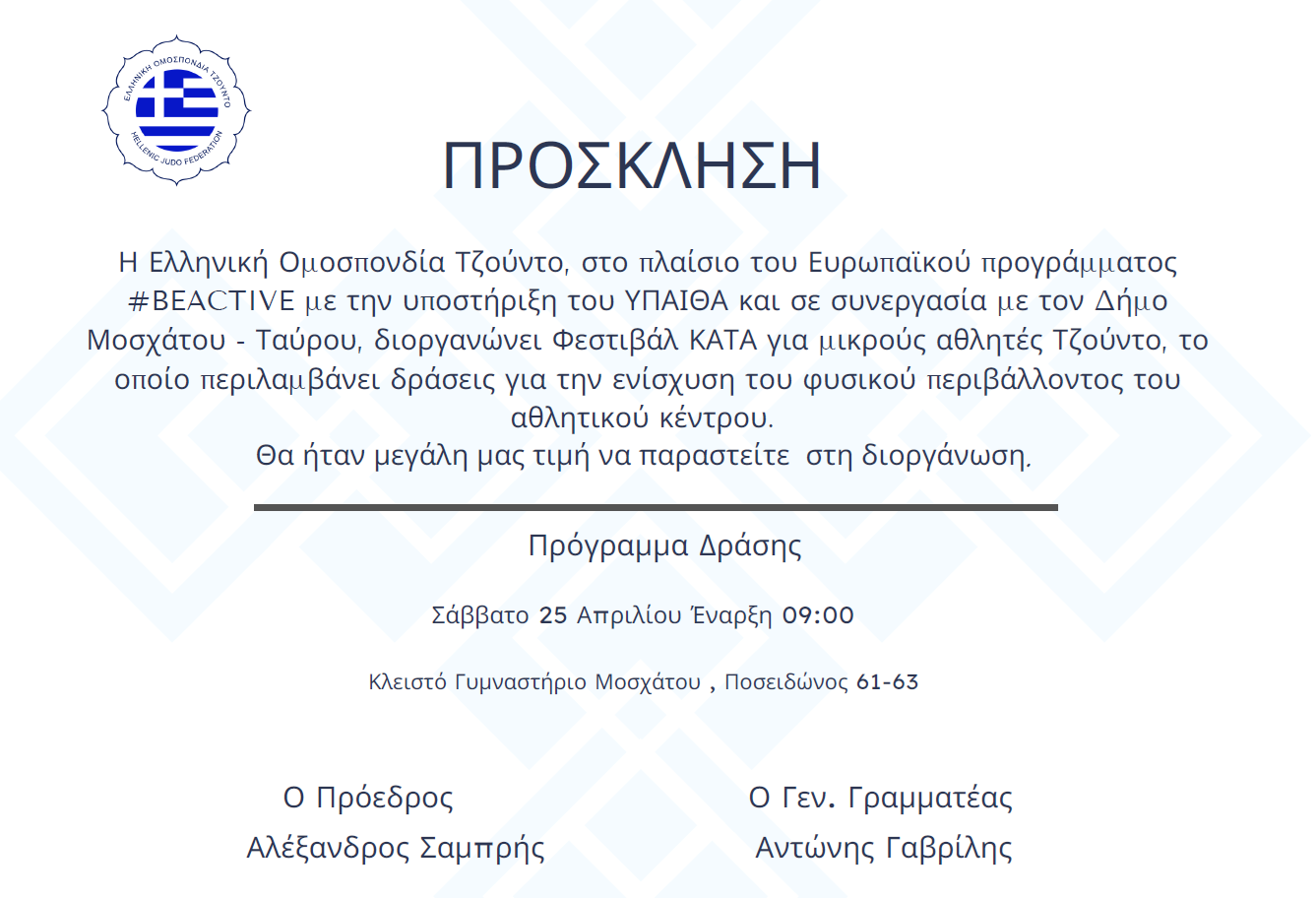 Η Ελληνική Ομοσπονδία Τζούντο διοργανώνει Φεστιβάλ ΚΑΤΑ για μικρούς αθλητές, στο κλειστό γυμναστήριο Μοσχάτου (Καποδιστρίου 2-4), το Σάββατο 25 Απριλίου 2026.